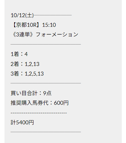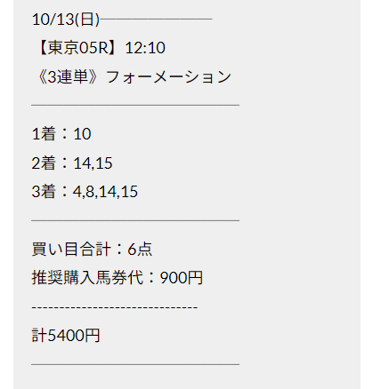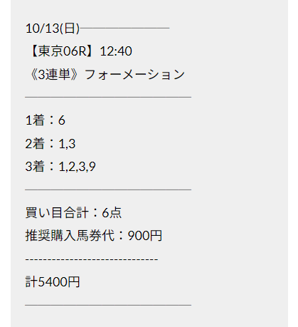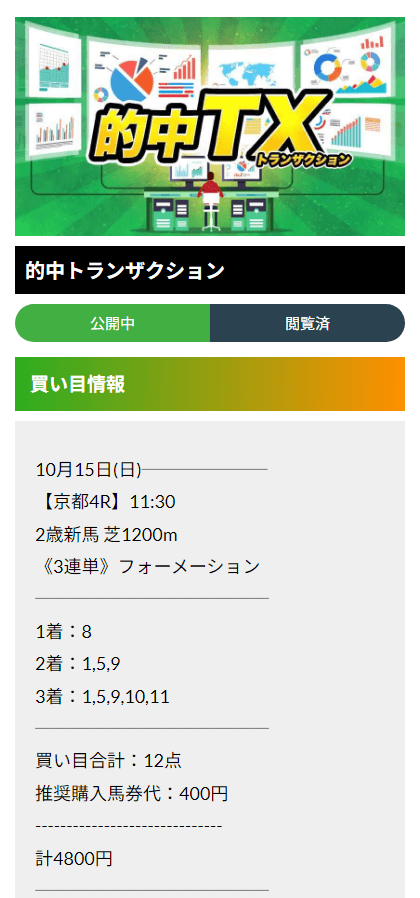 直近で参加したのは『的中トランザクション』という有料プランの予想。対象レースは2024年10月13日東京6R・3歳以上1勝です。