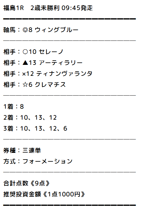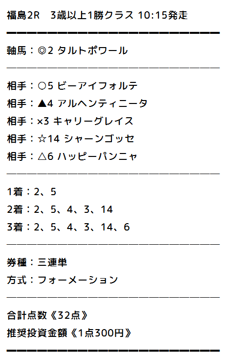 福島2Rの「3歳以上1勝クラス」では、たった1レースで250万円以上の払戻を獲得しています。