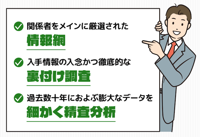 関係者から仕入れた厳選情報をもとに予想することで、当たりやすさ・稼ぎやすさ抜群の買い目を提供できているようです。