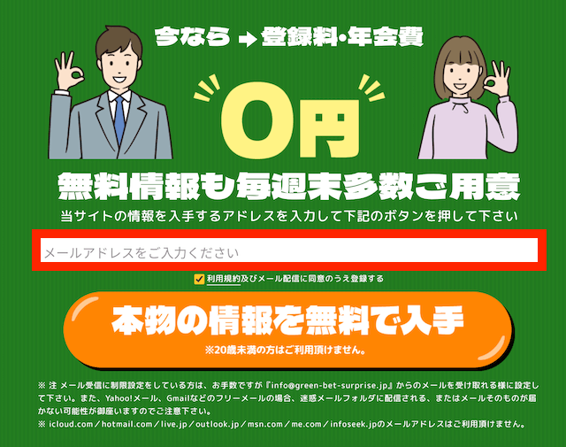 他サイトはLINEでの登録が多い中、みどりの的中らんどの登録方法はメールアドレスのみです。