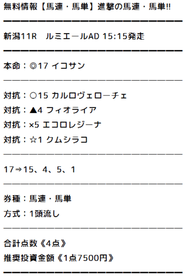 | みどりの的中らんど(無料予想) | ⑮-⑰ | 的中 | 5.6倍×7,500円=42000円 |