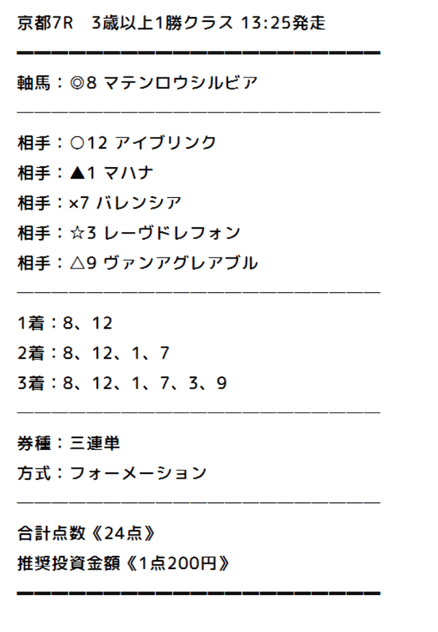 京都7Rの予想は外れたものの、展開と馬場適性の読みに優れていました。