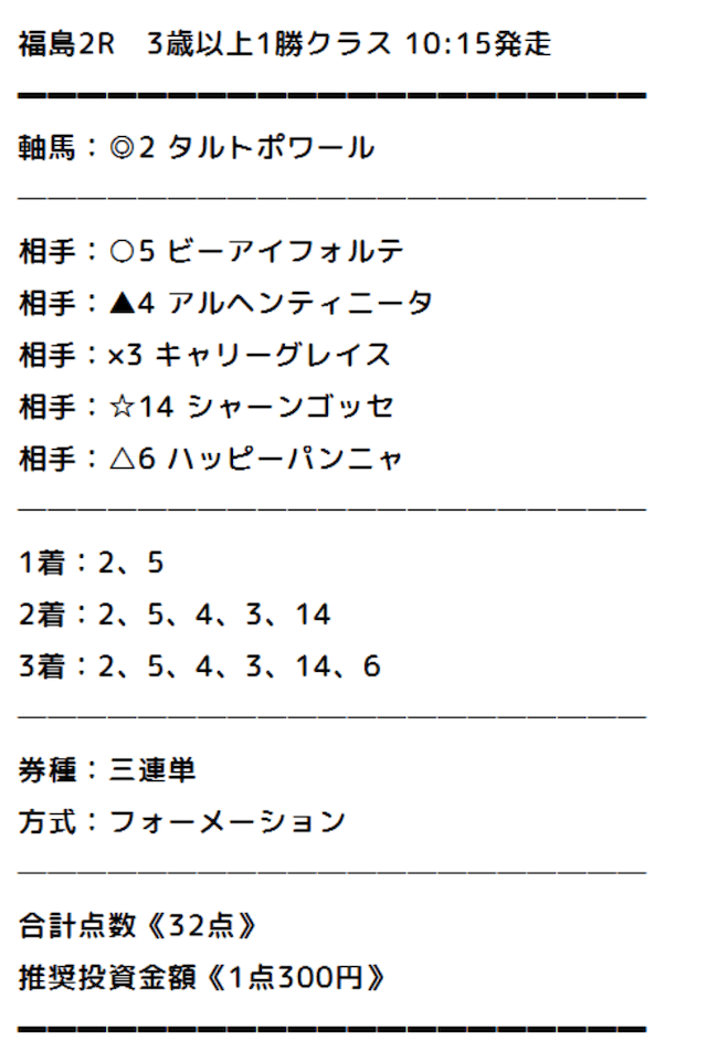 福島1Rでは点数を絞った勝負レースとして、1点1,000円の強気配分となっています。