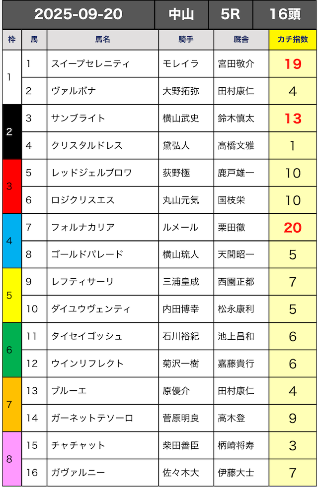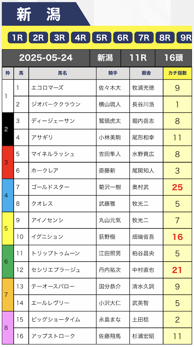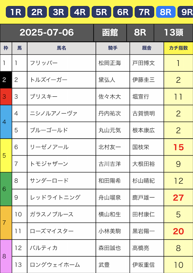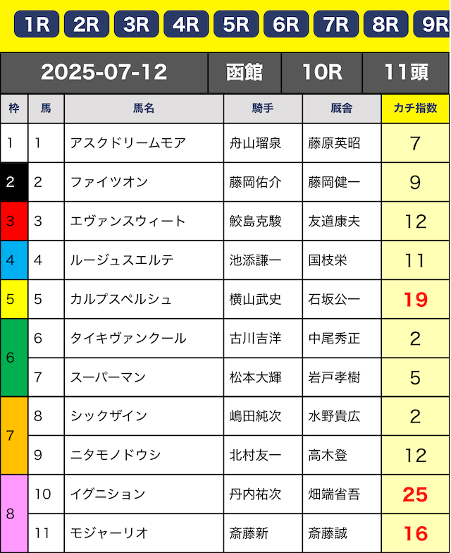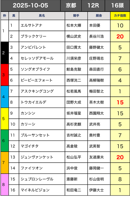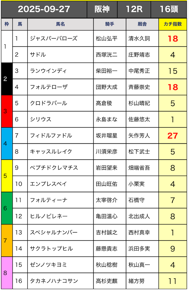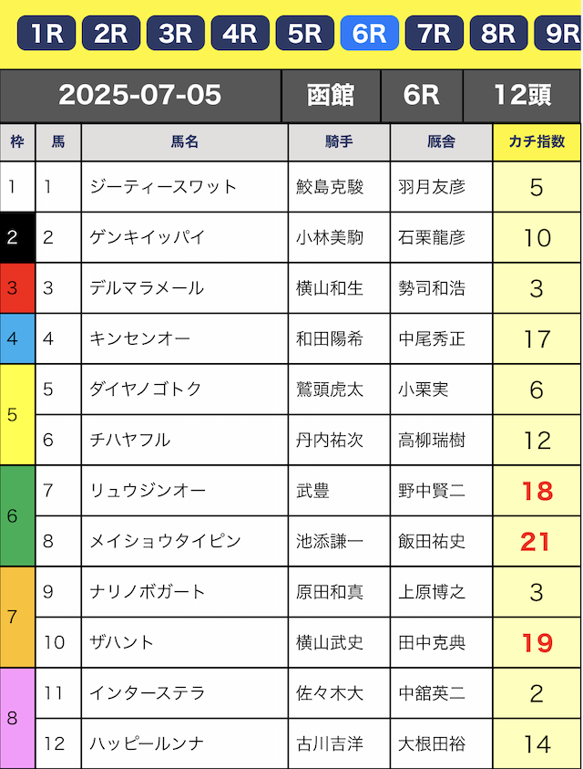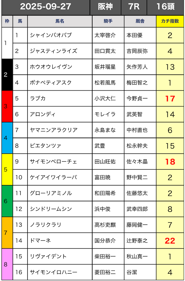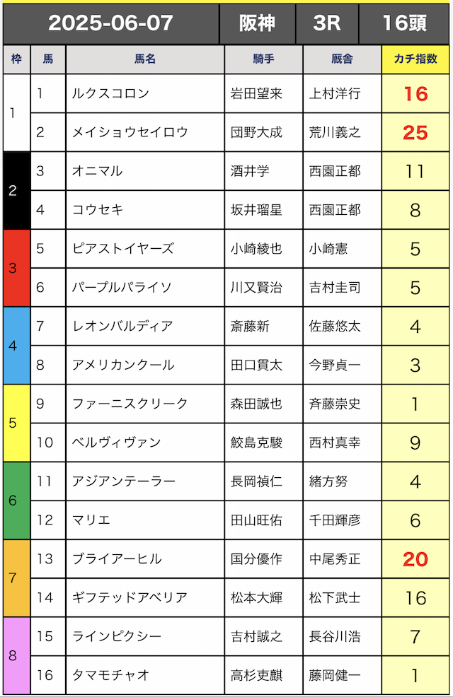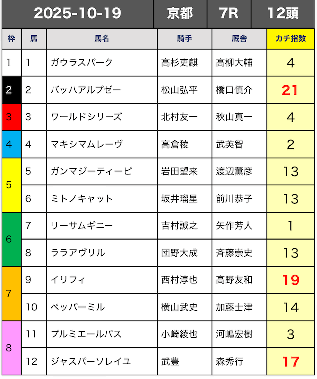 実績が少ない馬同士のレースでは、有力騎手がそのまま勝ち切ることが多いので⑦を軸に予想する方が多いハズです。