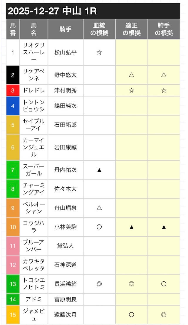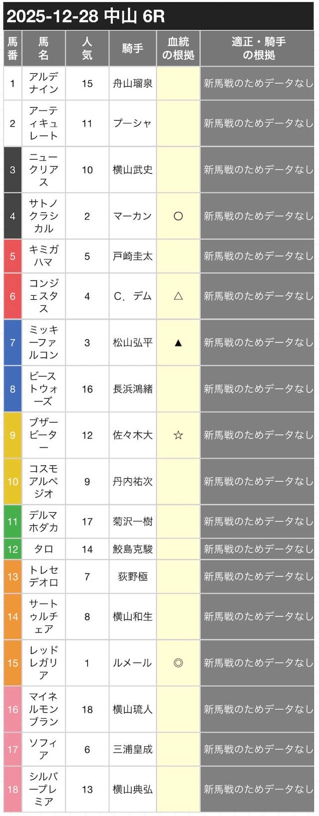 2025/12/28 中山6R メイクデビュー中山 10,000円 13,000円 条件戦 3連複