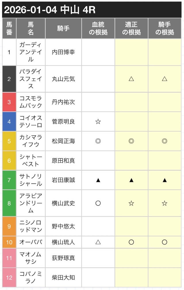 2026/01/04 中山4R 3歳未勝利 10,000円 23,700円 条件戦 3連複