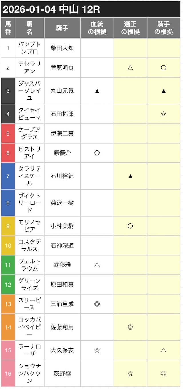 4番人気の⑫レディネスと8番人気の⑯マイネルエニグマを軸にした3連単予想。