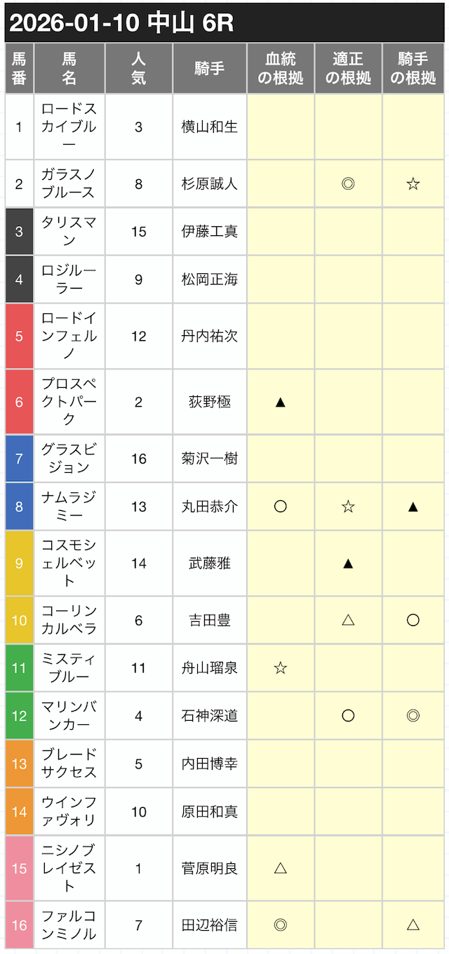 2026/01/10 中山6R 4歳以上1勝クラス 10,000円 0円 条件戦 3連複