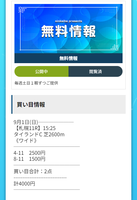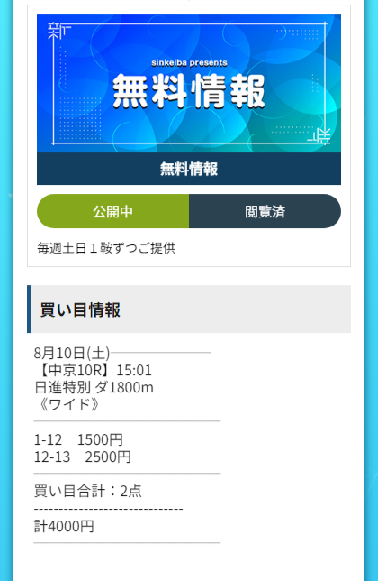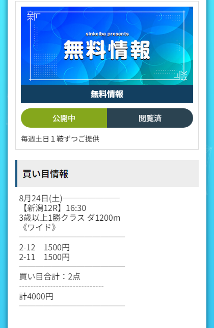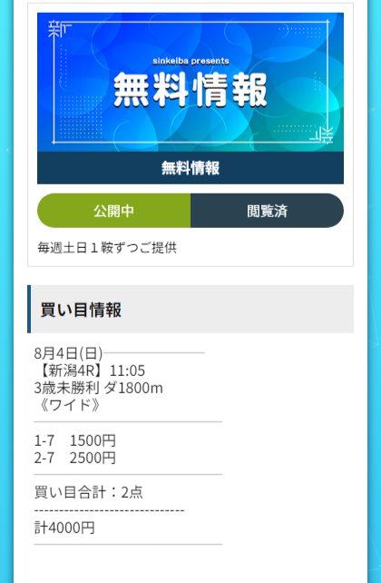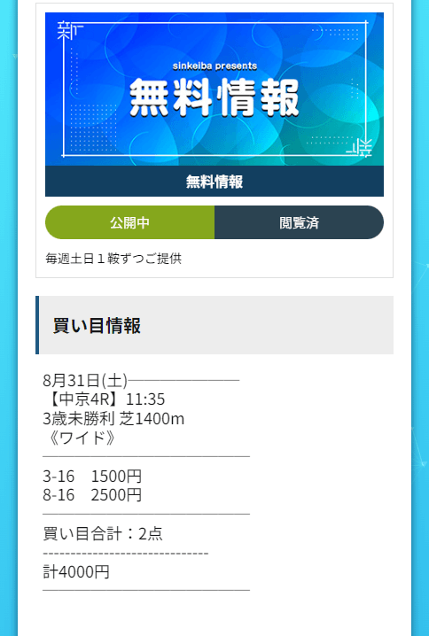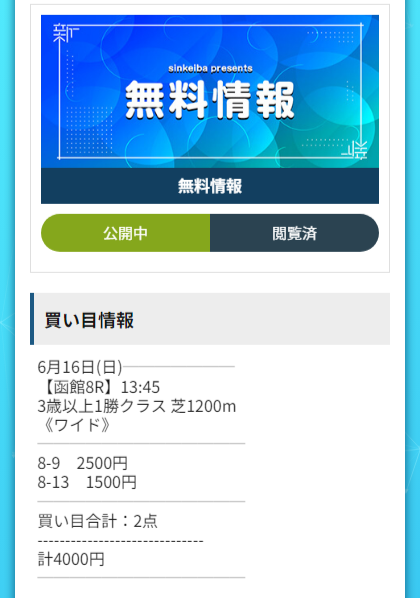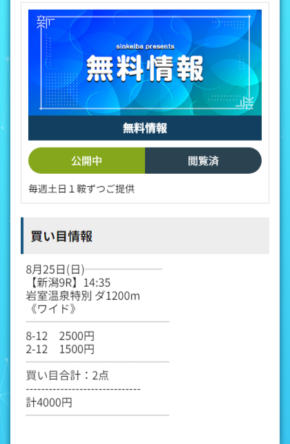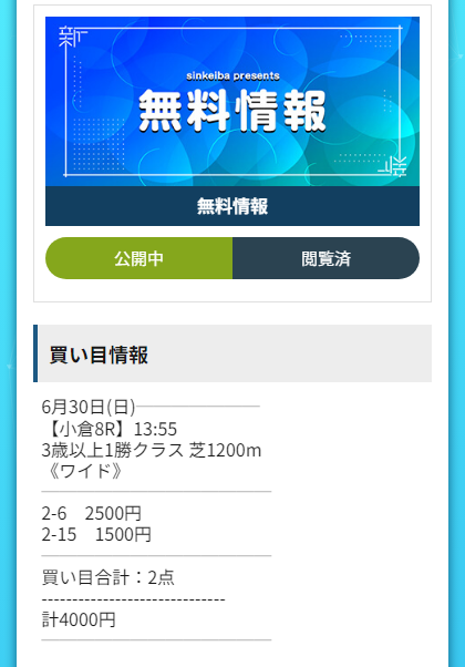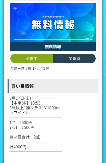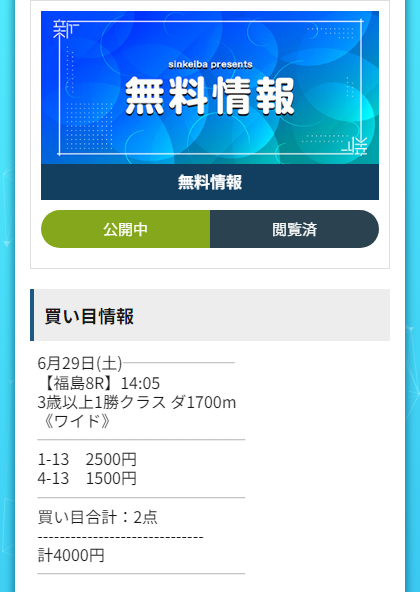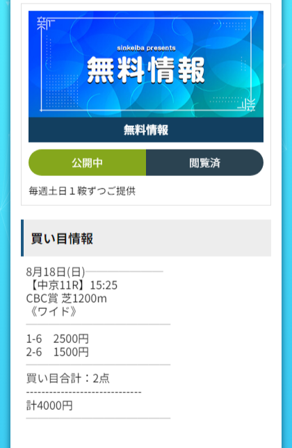 シンケイバを利用する方は、まずは無料予想で資金を増やし、有料予想に挑戦するといった流れを踏むといいでしょう。