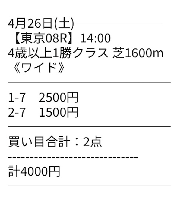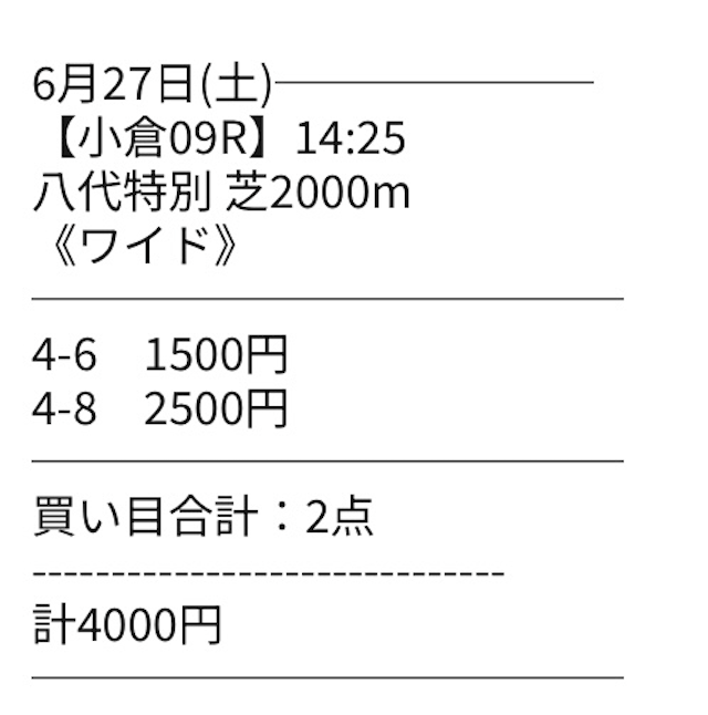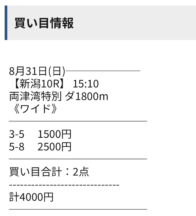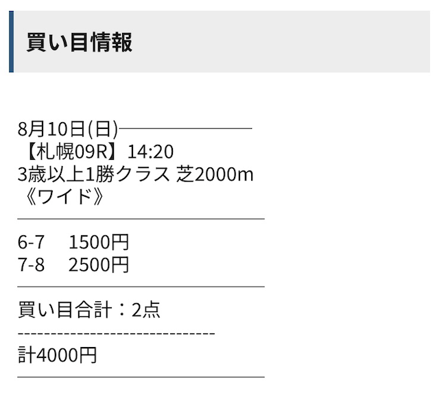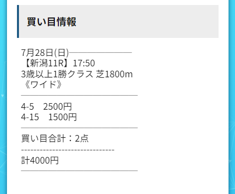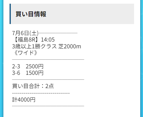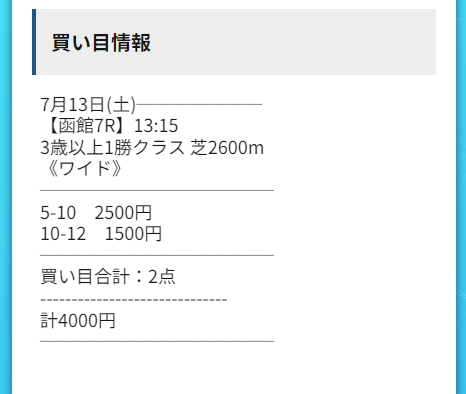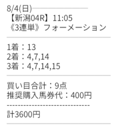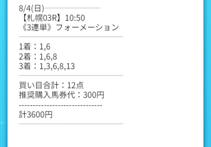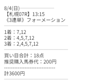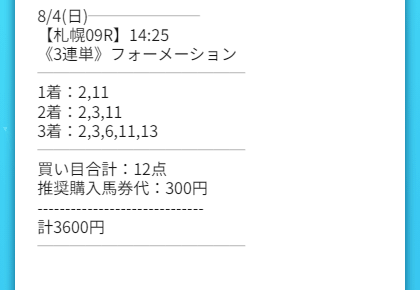 直近で参加したのは『馬心伝心』という有料プランの予想。対象レースは2024年8月4日札幌9R・HTB賞です。