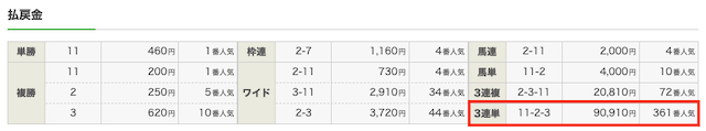3連単のオッズは909.1倍がつき、1点300円で購入していたため272,730円の払い戻しを獲得することができました!