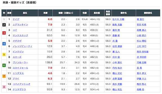 エグランタインは3歳の時にローズS(G2)へ出走し3着と好走しており、実力もある1頭。前走の9着が響いてか人気はエリヌダスに一歩及ばずといったところですが、個人的に実力に差はないと見ています。