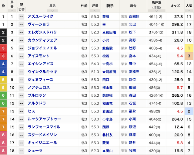 なんと、初出走の⑰キュイジニエールが馬券に絡むと予想しています。