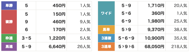 1番人気の⑤ジョワイユノエルの好走と、9番人気⑨ジュヌフィーユの激走を読み当てました。
