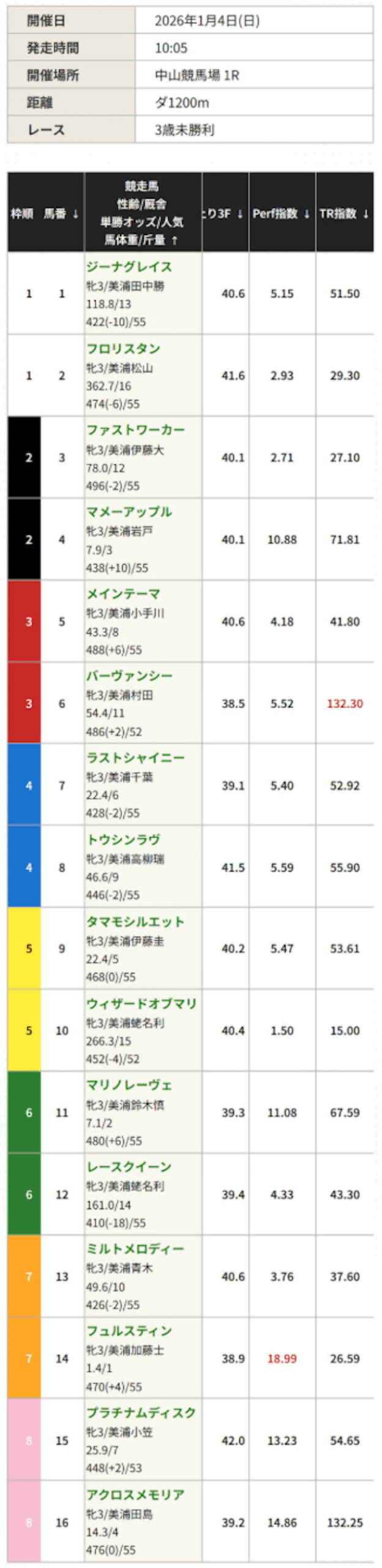 - Perf指数:上がりタイム・位置取り・不利な展開などのデータをもとに勝ちやすさを示した数値