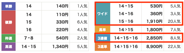 | 3連複 | ⑭-⑮-⑯ | 的中 | 28.5倍×1,000円=28,500円 |