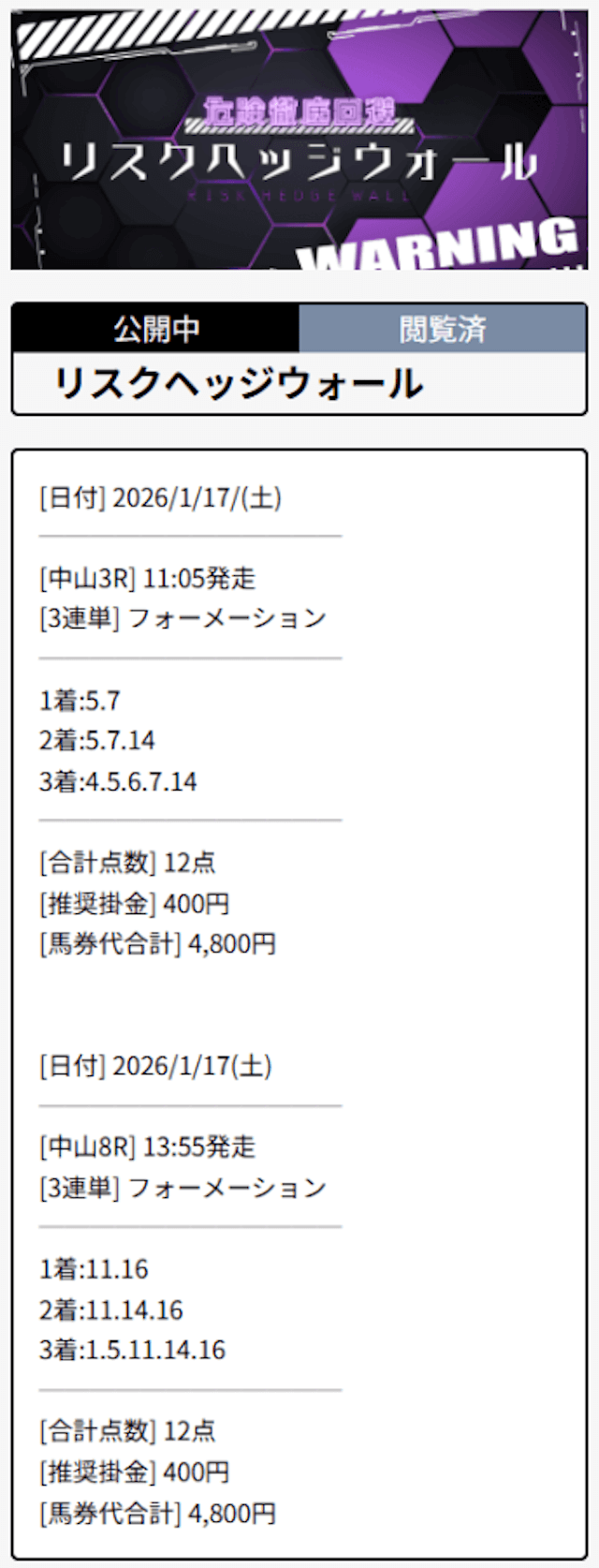 有料予想の初検証は、4レース分の予想を提供している「リスクヘッジウォール」。