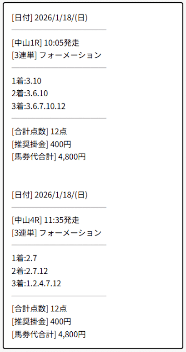 | 2026年1月18日 中山1R | ⑩-⑥-⑫ | 的中 | 317.4倍×400円=126,960円 |