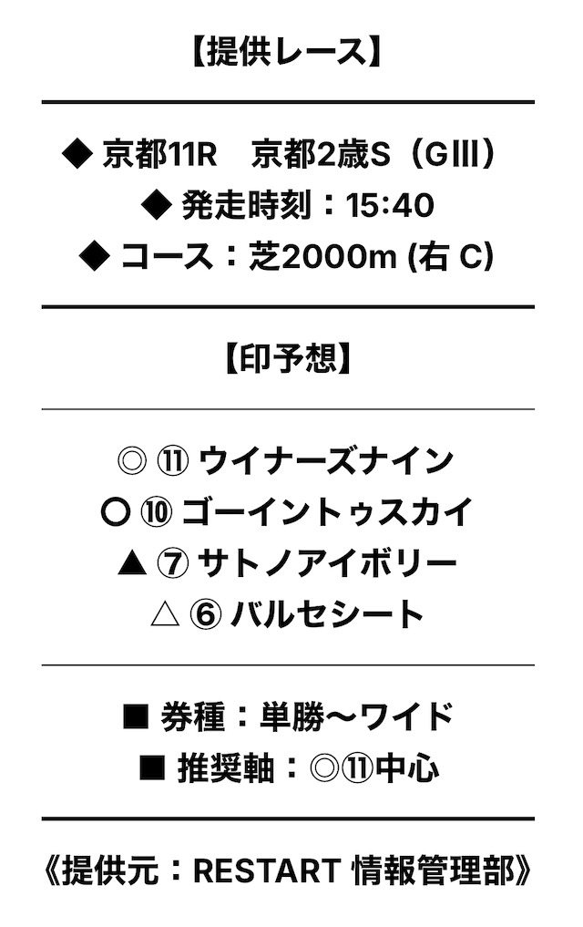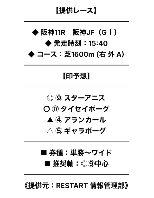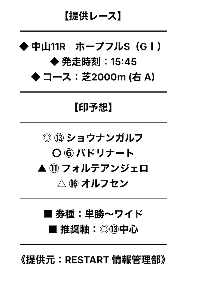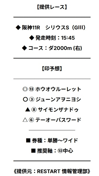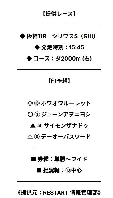 リスタートが選定したのは⑬ホウオウルーレット(8番人気)、③ジューンアヲニヨシ(4番人気)、⑧サイモンザナドゥ(9番人気)、⑥テーオーパスワード(1番人気)の4頭。