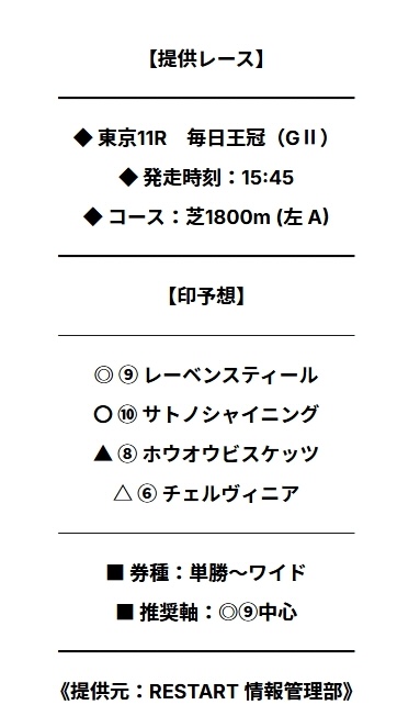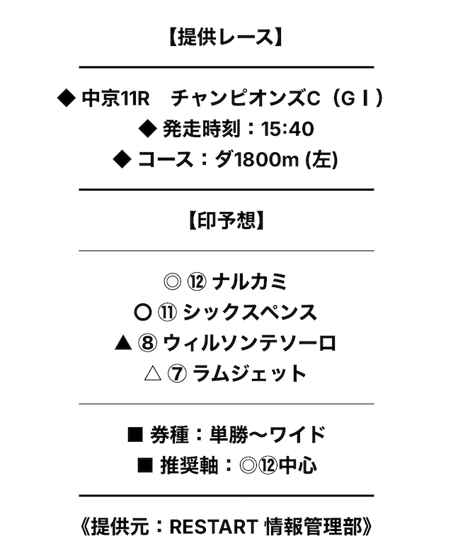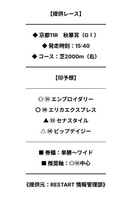 他にも馬券内率が高い馬が複数頭出走するレースですが、リスタートはどんな予想で勝負するのか。