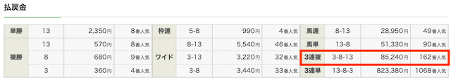 1点1,000円で馬券を購入していたため、852,400円の払い戻しを獲得。