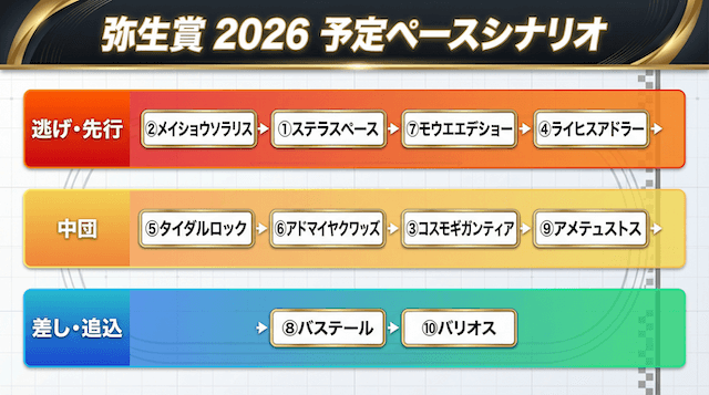 =ライヒスアドラー、タイダルロック、ステラスペースなど、好位を取りたい馬が多く、互いに牽制しながら進む形が想定される。