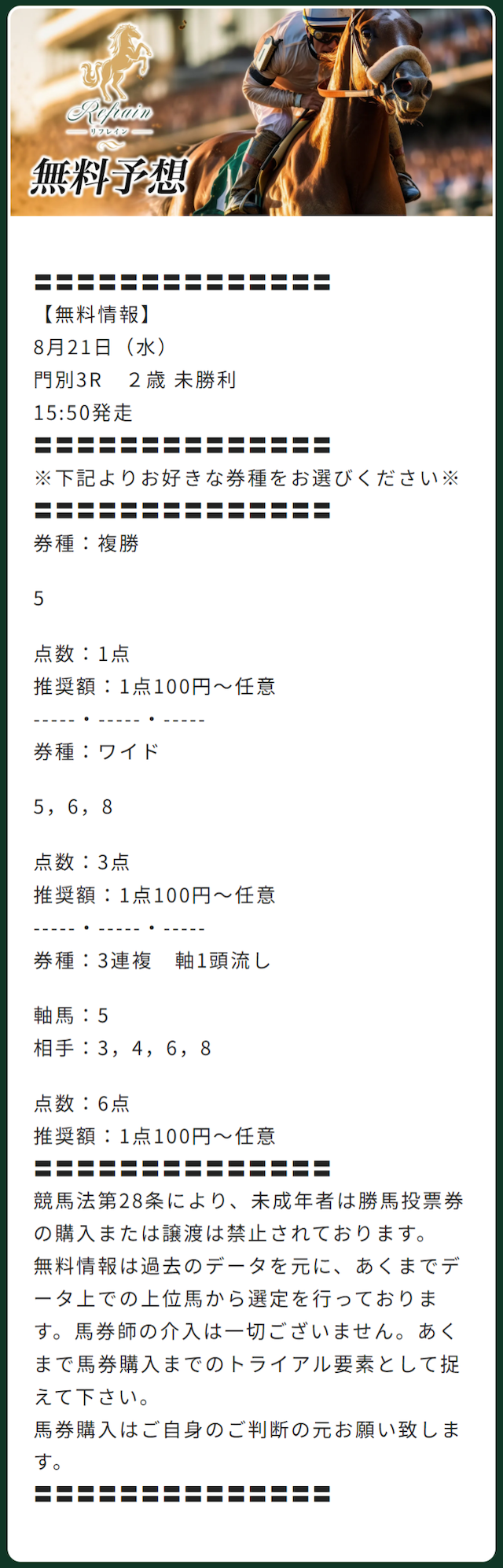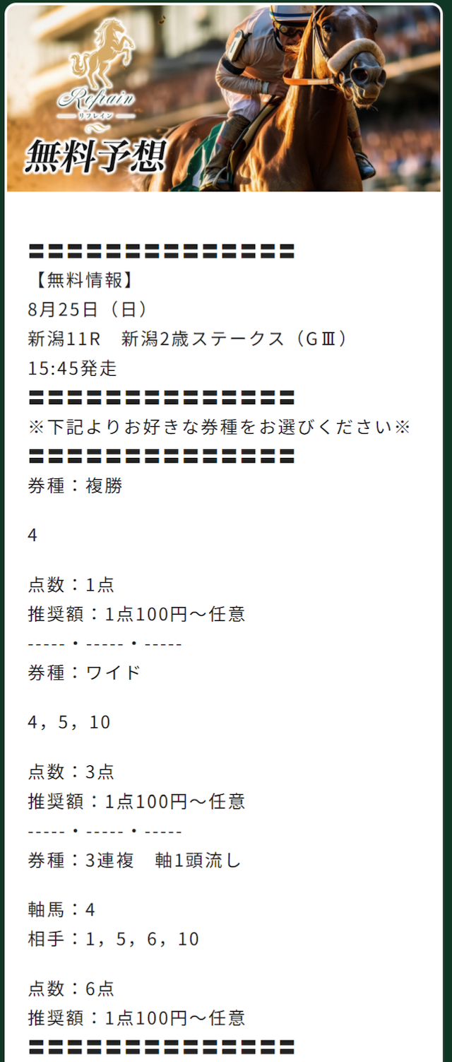 分析とは別で、リフレインが最も稼いだ無料予想をご紹介します。