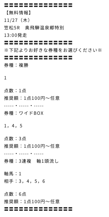 2025/11/27 笠松5R 奥飛騨温泉郷特別(A) 6,000円 11,500円 一般 3連複