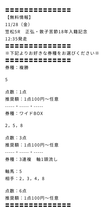 2025/11/28 笠松5R 正弘・敦子苦節18年入籍記念(C) 7,000円 12,400円 一般 3連複・複勝