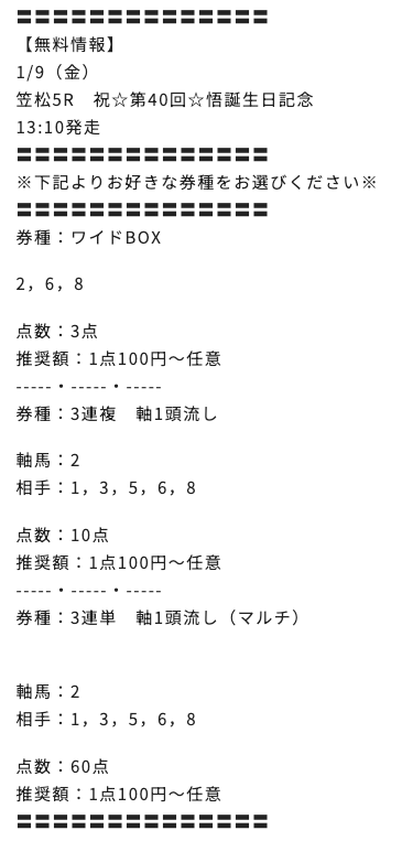 2026/01/09 笠松5R 祝☆第40回☆悟誕生日記念(C) 10,000円 13,500円 一般 3連複