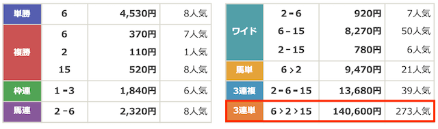 | 3連単 | ⑥→②→⑮ | 的中 | 500円×1406.0倍=2,613,960円 |
