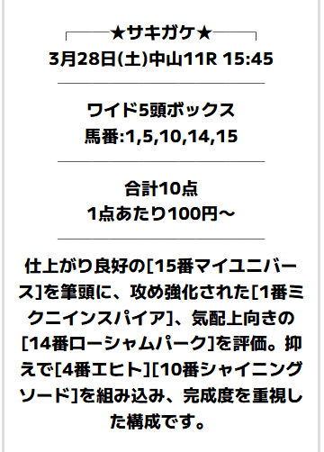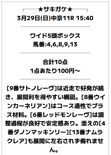 では、このレースに対してサキガケはどのような買い目で勝負したのか。実際に公開された予想を見ていきましょう!