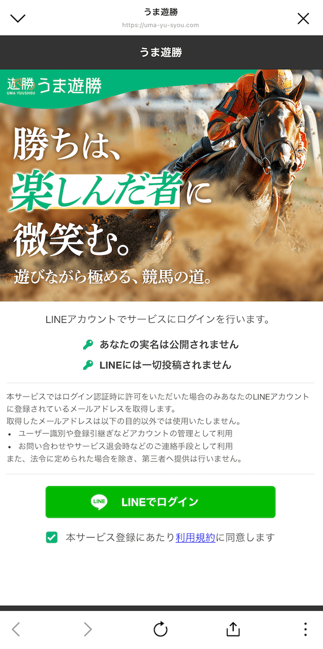 ④うま遊勝の画面に切り替わるので「LINEでログイン」からサイトへとログイン