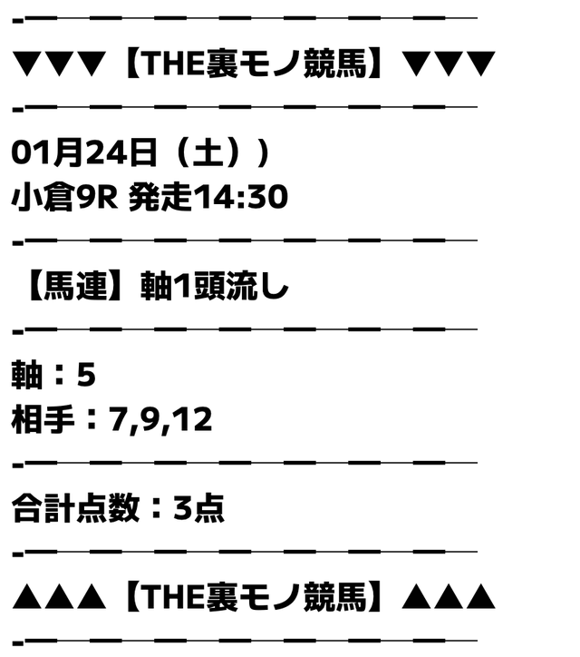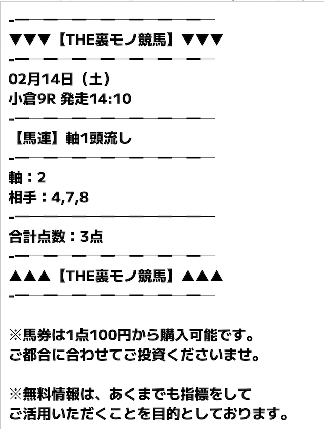 この状況下で、裏モノ競馬はどんな予想で勝負するのか。実際に公開された買い目がこちらです。