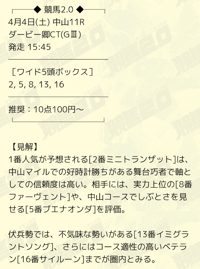 これらの特徴を踏まえて、競馬2.0の無料予想はどのように予想したのか。
