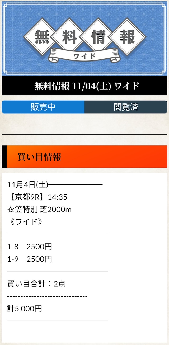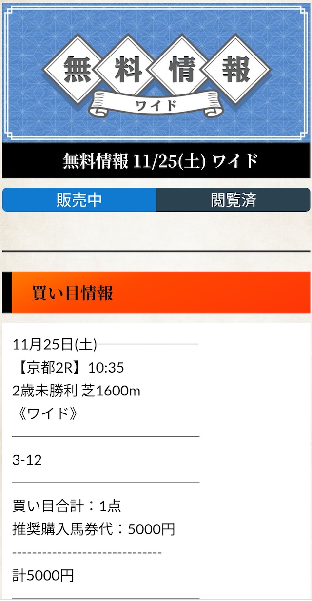 | 2024/11/02 | 2歳未勝利 | 6,000円 | 条件戦 | ワイド |